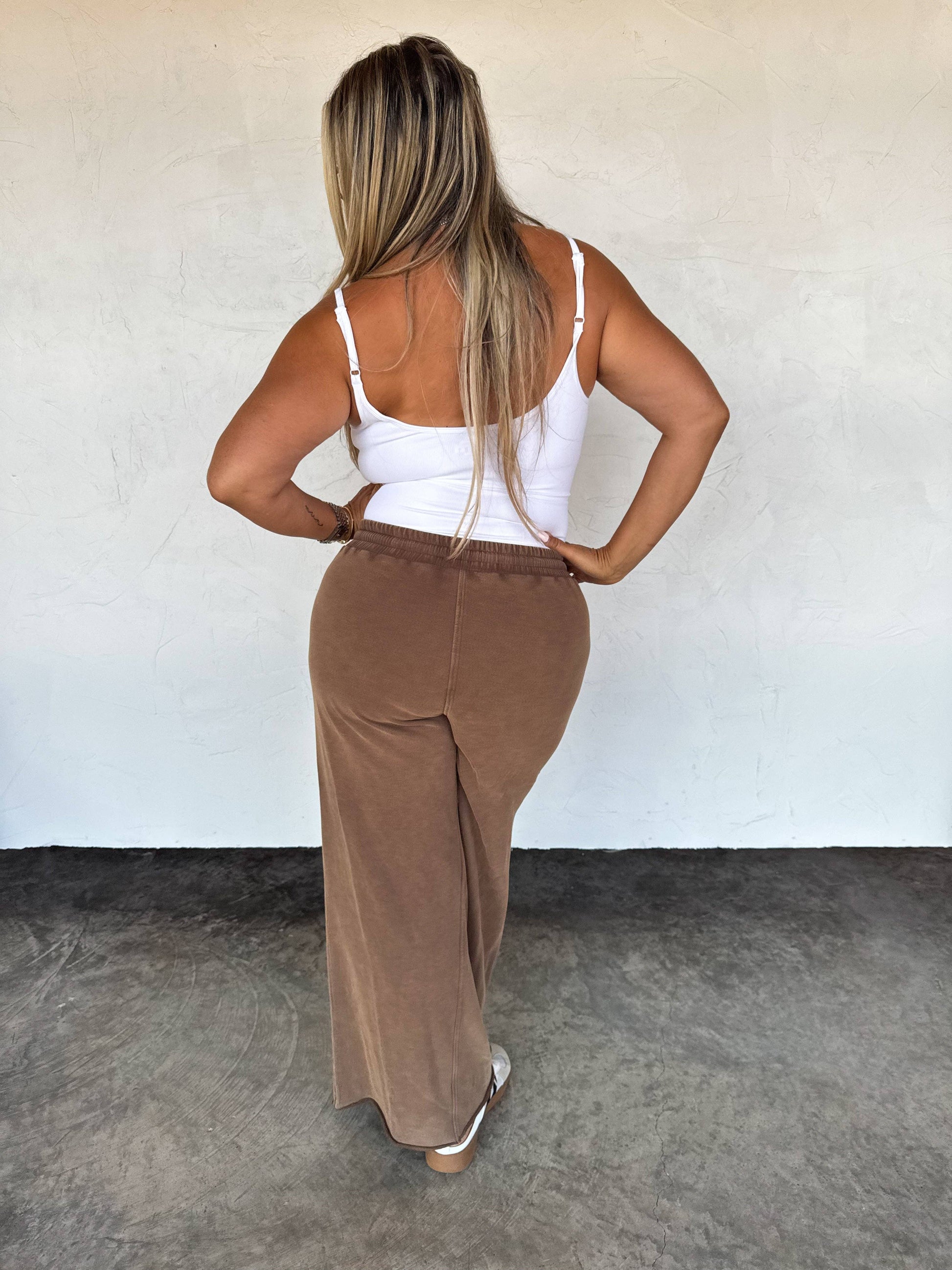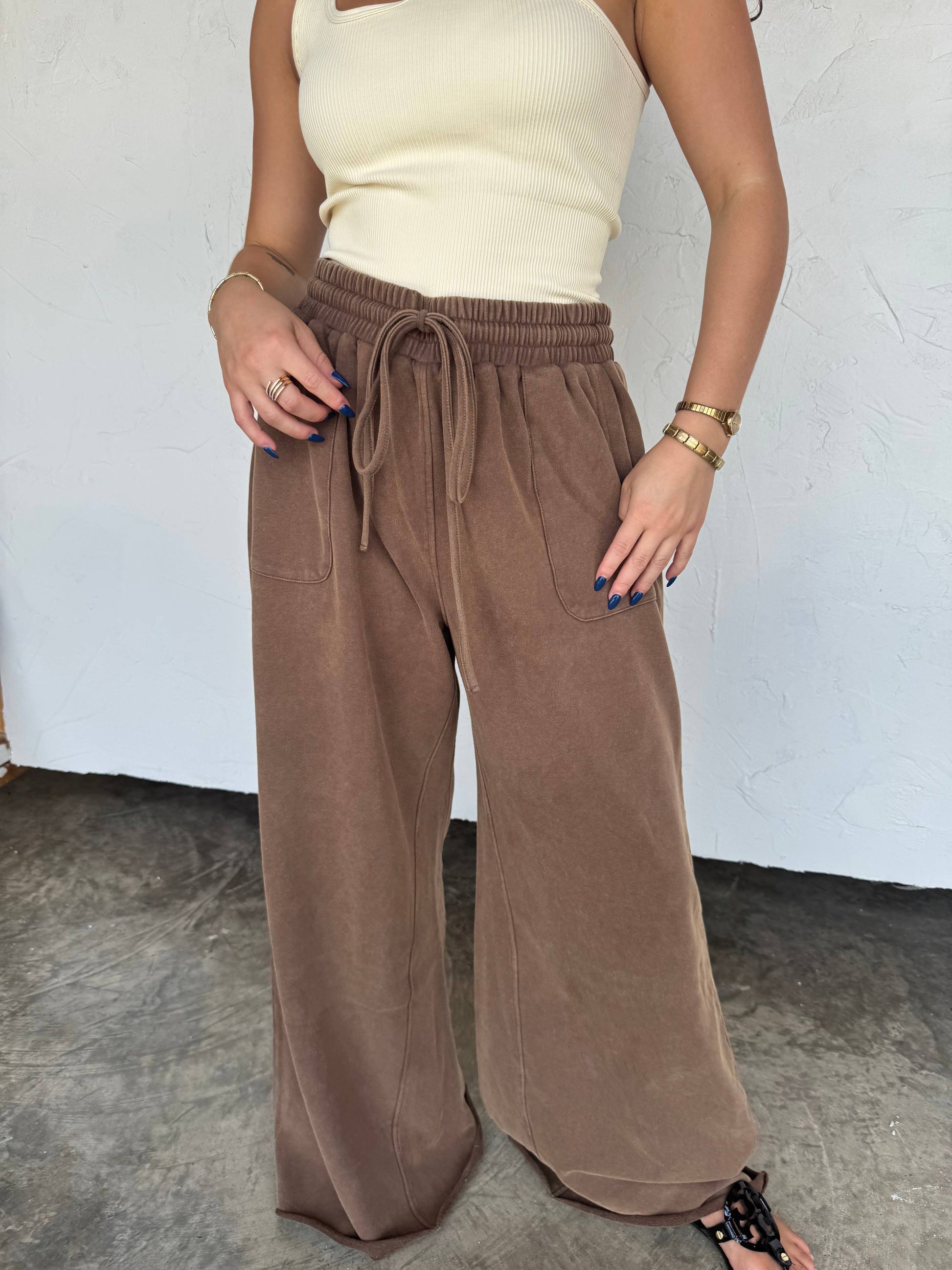 These wide leg pants feature a slight high-rise fit with an adjustable drawstring waistband for all-day comfort. Designed with bold front patch pockets and exposed seam and raw hem detailing, they offer a casual yet elevated look. The washed cotton fabric adds a vintage vibe, while the relaxed wide leg cut keeps them effortlessly cool and easy to style.